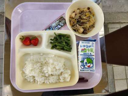 今日の献立は、ご飯、すき焼き煮、三度豆のごまあえ、焼きのり、いちご、牛乳でした。