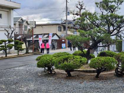 正門では、朝の挨拶運動をしています。「おはようございます」大きな声が聞こえています。