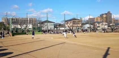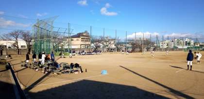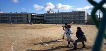 グラウンドでは、野球部の練習試合が行われています。