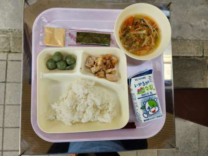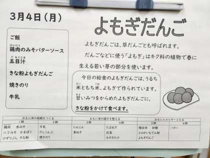 今日の献立は、ご飯、鶏肉のみそバターソース、五目汁、きな粉よもぎだんご、焼きのり、牛乳でした。