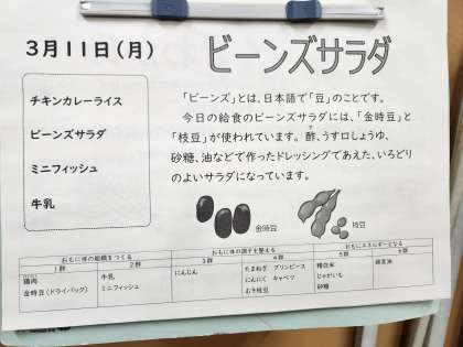 「ビーンズ」とは、日本語で「豆」のことです。「枝豆」が使われています。酢、うす口しょうゆ、砂糖、油などで作ったドレッシングであえた、いろどりのよいサラダになっていました。