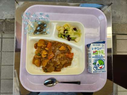 今日の献立は、チキンカレーライス、ビーンズサラダ、ミニフィッシュ、牛乳でした。