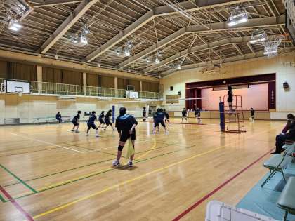 女子バレーボール部が体育館で試合をしています。先日、卒業式を終えた3年生を交えて行っています。