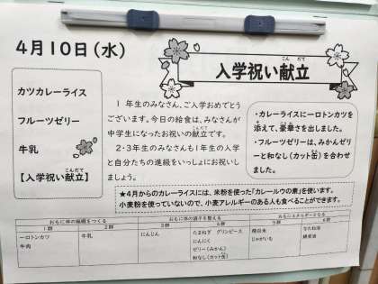 1年生の皆さん、ご入学おめでとうございます。今日の給食は、皆さんが中学生になったお祝いの献立です。
