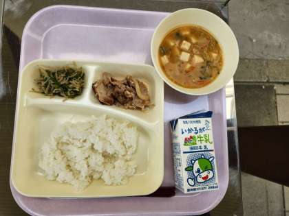 今日の献立は、ご飯、豚肉のしょうが焼き、とうふのみそ汁、じゃこピーマン、牛乳でした。