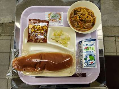 今日の献立は、コッペパン、アプリコットジャム、カレースープスパゲッティ、キャベツのピクルス、おさつチップス、牛乳でした。