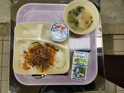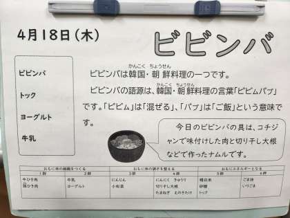 今日の献立は、ビビンバ、トック、ヨーグルト、牛乳でした。