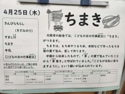 大阪市の給食では、子どもの日の行事献立に「ちまき」がつきます。