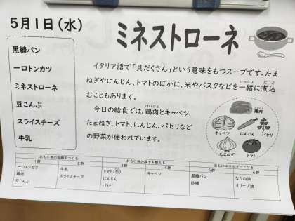 今日の献立は、黒糖パン、一口とんかつ、ミネストローネ、豆こんぶ、スライスチーズ、牛乳でした。