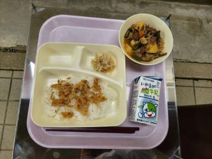 今日の献立は、ご飯、みそ肉じゃが、もやしの甘酢あえ、ごまかかいため、牛乳でした。