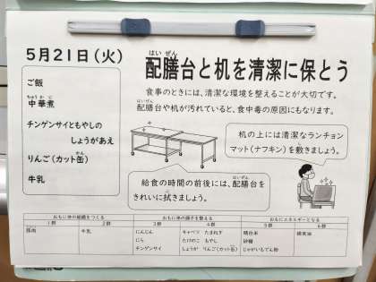 給食の時間の前後には、配膳台をきれいに拭きましょう。