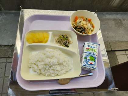 今日の給食の献立は、ご飯、中華煮、チンゲンサイともやしのしょうがあえ、りんご(カット缶)、牛乳でした。