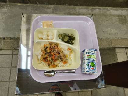 今日の給食の献立は、豚丼、きゅうりの梅風味、白玉だんご(きな粉)、牛乳でした。