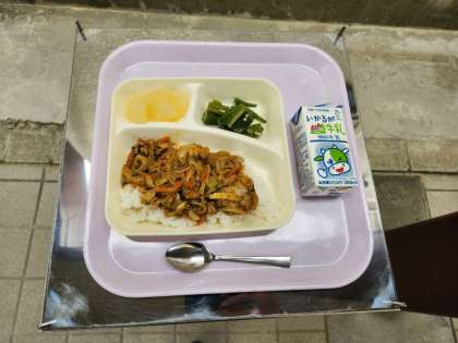 今日の給食の献立は、和風カレー丼、オクラのかつお梅風味、和なし(カット缶)、牛乳でした。