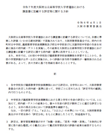 令和7年度大阪府公立高等学校入学者選抜における調査書に記載する評定等に関する方針