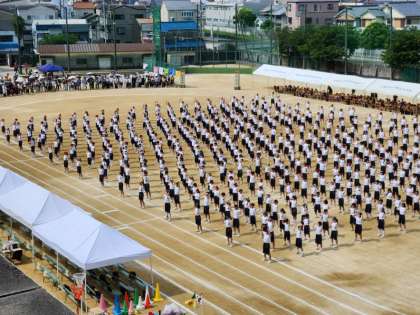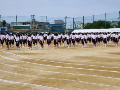 いよいよ競技が始まります。準備体操(ラジオ体操)の様子です。