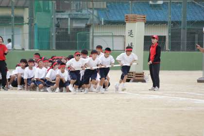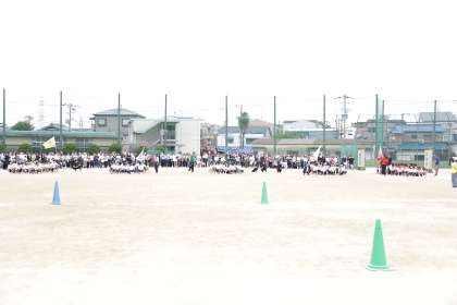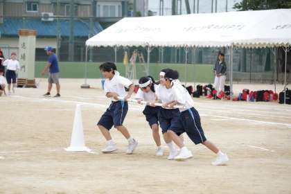 4人一組となり、全員が一本の長い棒を持ち、きめられたコースを走ります。コーンの途中にコーンがあり、そこを一回転します。