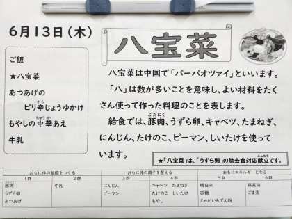 給食では、豚肉、うずら卵、キャベツ、たまあねぎ、にんじん、たけのこ、ピーマン、しいたけを使っていました。