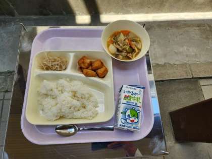 今日の給食の献立は、ご飯、八宝菜、あつあげのピリ辛じょうゆかけ、もやしの中華あえ、牛乳でした。