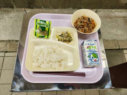 今日の給食の献立は、ご飯、マーボー豆腐、チンゲンサイともやしの甘酢あえ、まっ茶大豆、牛乳でした。