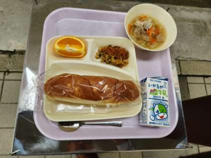 今日の給食の献立は、おさつパン、カレードリア、豚肉とキャベツのスープ、オレンジ、牛乳でした。