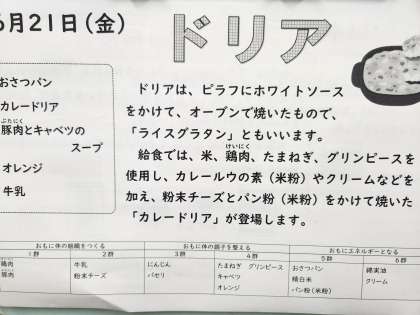 給食では、米、鶏肉、たまねぎ、グリンピースを使用し、カレールウの素(米粉)やクリームなどを加え、粉末チーズとパン粉(米粉)をかけて焼いた「カレードリア」が登場します。