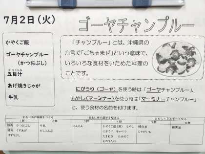 今日の献立は、かやくご飯、ゴーヤチャンプル(かつおぶし)、五目汁、あげ焼きじゃが、牛乳でした。