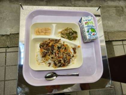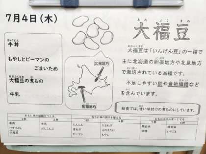 今日の献立は、牛丼、もやしとピーマンのごまいため、大福豆の煮もの、牛乳でした。