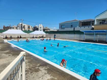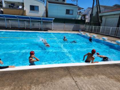 水泳に取り組んでいます。バタフライの足の使い方について学んでいるようです。