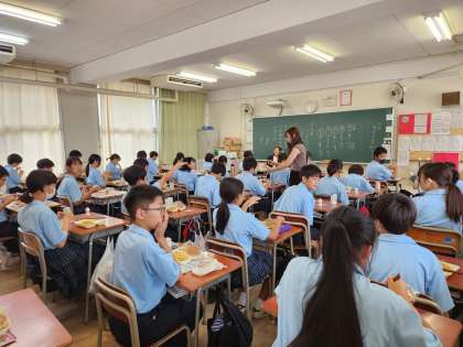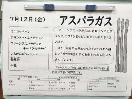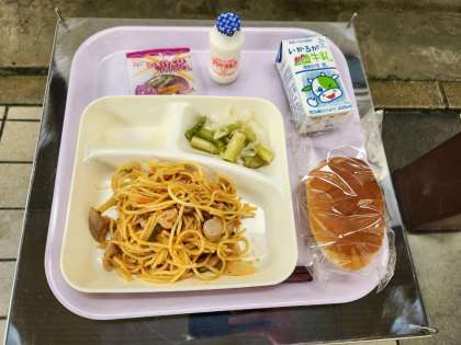 今日の給食の献立は、ミニコッペパン、チキントマトスパゲティ、グリーンアスパラガスとキャベツのサラダ、いもけんぴフィッシュ、発酵乳、牛乳でした。
