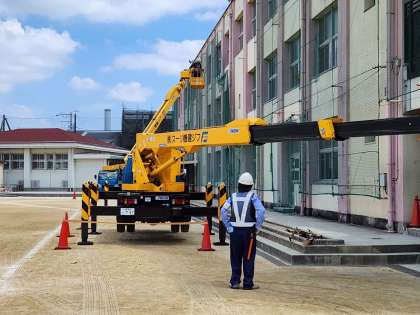 B館の外壁工事に伴い、防球ネットの取り外しを行っています。