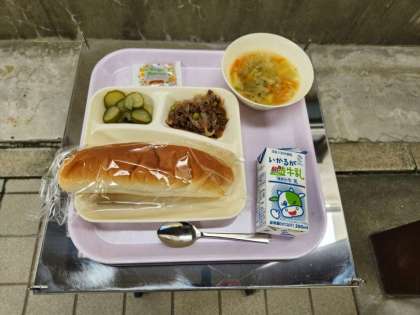 今日の献立は、コッペパン、アプリコットジャム、牛肉のソース煮、スープ、きゅうりのピクルス、牛乳でした。