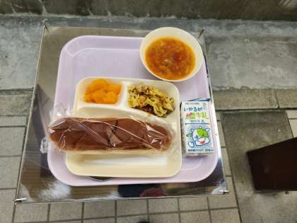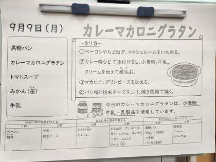 今日の献立は、黒糖パン、カレーマカロニグラタン、トマトスープ、みかん(缶)、牛乳でした。