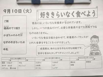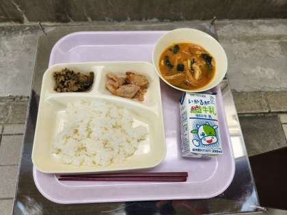 今日の献立は、ご飯、鶏肉のてり焼き、かぼちゃのみそ汁、なすのそぼろいため、牛乳でした。