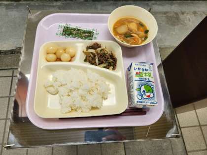 ご飯、一口がんもとさといものみそ煮、、牛肉と野菜のいためもの、みたらしだんご、焼きのり、牛乳でした。