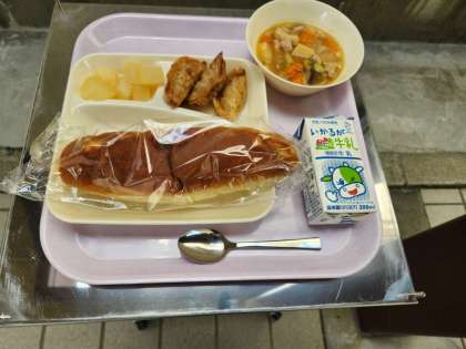 今日の献立は、おさつパン、あげギョーザ、鶏肉ととうがんの中華煮、和なし(カット缶)、牛乳でした。
