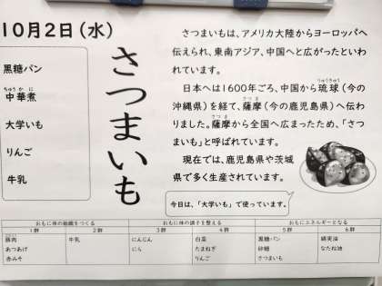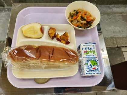 今日の給食の献立は、黒糖パン、中華煮、大学いも、りんご、牛乳でした。