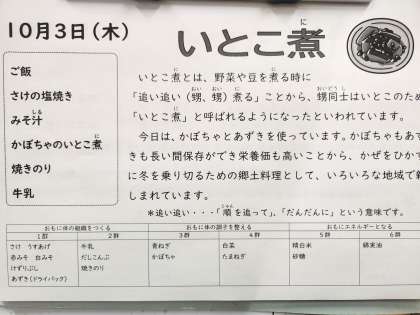 今日は、かぼちゃとあずきを使っています。かぼちゃもあずきも長い間保存ができ栄養価も高いことから、かぜをひかずに冬を乗り切るための郷土料理として、いろいろな地域で親しまれています。