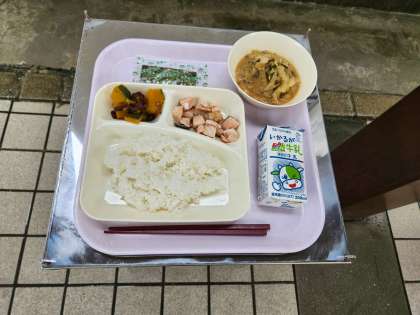 今日の給食の献立は、ご飯、さけの塩焼き、みそ汁、かぼちゃのいとこ煮、焼きのり、牛乳でいた。