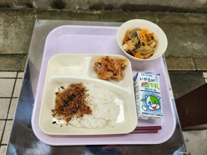 今日の給食の献立は、ご飯、鶏肉のたつたあげ、あつあげと野菜の煮もの、おかかなっ葉、牛乳でした。