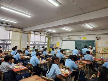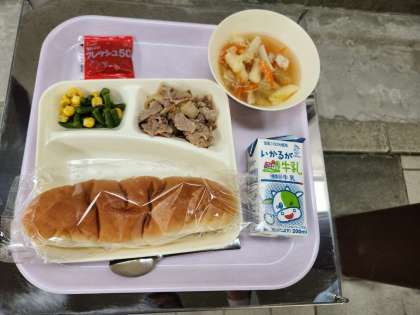 今日の給食の献立は、コッペパン、いちごジャム、豚肉のガーリック焼き、鶏肉と野菜のスープ、三度豆とコーンのソテー、牛乳でした。