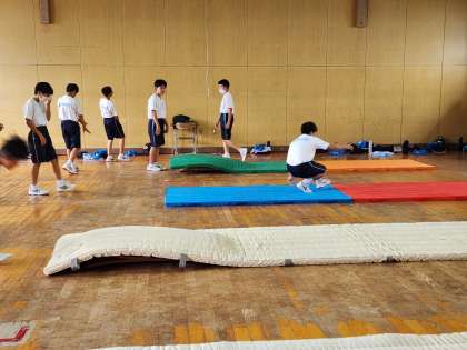 マット運動、回転系の基本的な技に取り組んでいます。滑らかにできるよう繰り返し行っています。