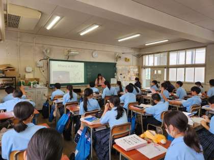 「どこ」なのかを尋ねたり、その質問に答えたりすることができることをねらいとして授業が行われました。