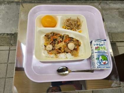 今日の給食の献立は、中華丼、もやしとコーンのごまいため、桜桃(缶)、牛乳でした。