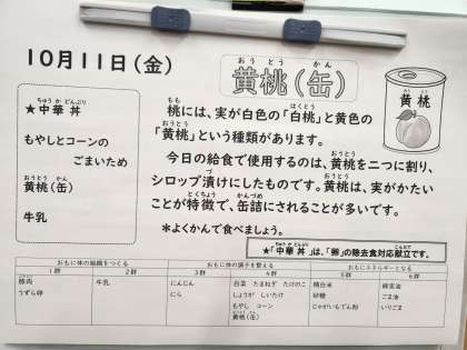 今日の給食では使用するのは、桜桃を二つに割り、シロップ漬けにしたものです。黄桃は、実がかたいことが特徴で、缶詰にされることが多いです。