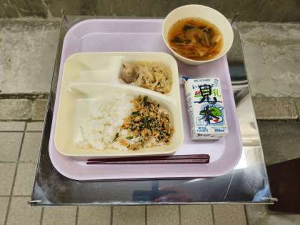 今日の給食の献立は、ご飯、鶏肉のゆず塩焼き、ソーキ汁、ツナ大豆そぼろ、牛乳でした。