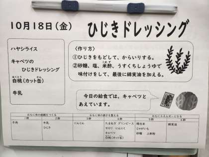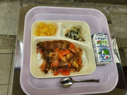 今日の献立は、ハヤシライス、キャベツのひじきドレッシング、白桃(カット缶)、牛乳でした。