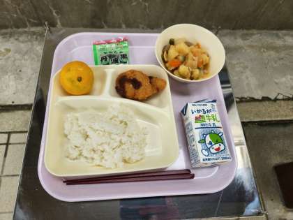 今日の給食の献立は、ご飯、みそ汁、ジャガイモと野菜の煮もの、ソフト黒豆、みかん、牛乳でした。
