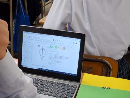 「証明」について学習しています。図形の性質を使って、仮定から結論へ筋道を立てて導きます。