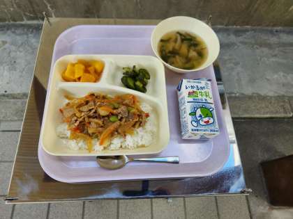 今日の給食の献立は、ピリ辛丼、中華スープ、きゅうりの甘酢づけ、黄桃(カット缶)、牛乳でした。